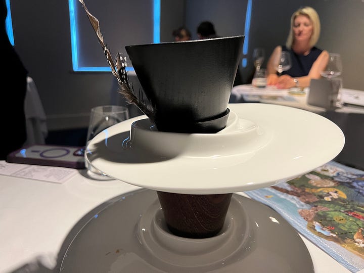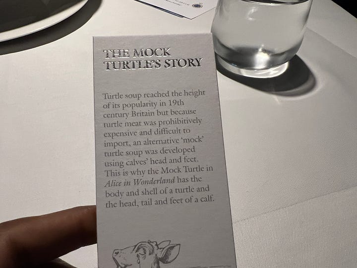 A tea bag, a kettle, and a teacup. The story behind Mock Turtle Soup traces back to a time when real turtle was too expensive, so chefs used goat’s heads and feet to recreate the flavour. Even before the course reached the table, the aroma drifting from the back of the house was thrilling. When it finally arrived, we were presented with the full mock turtle setup alongside an afternoon-tea-style arrangement complete with the Mad Hatter’s hat and dainty sandwiches.