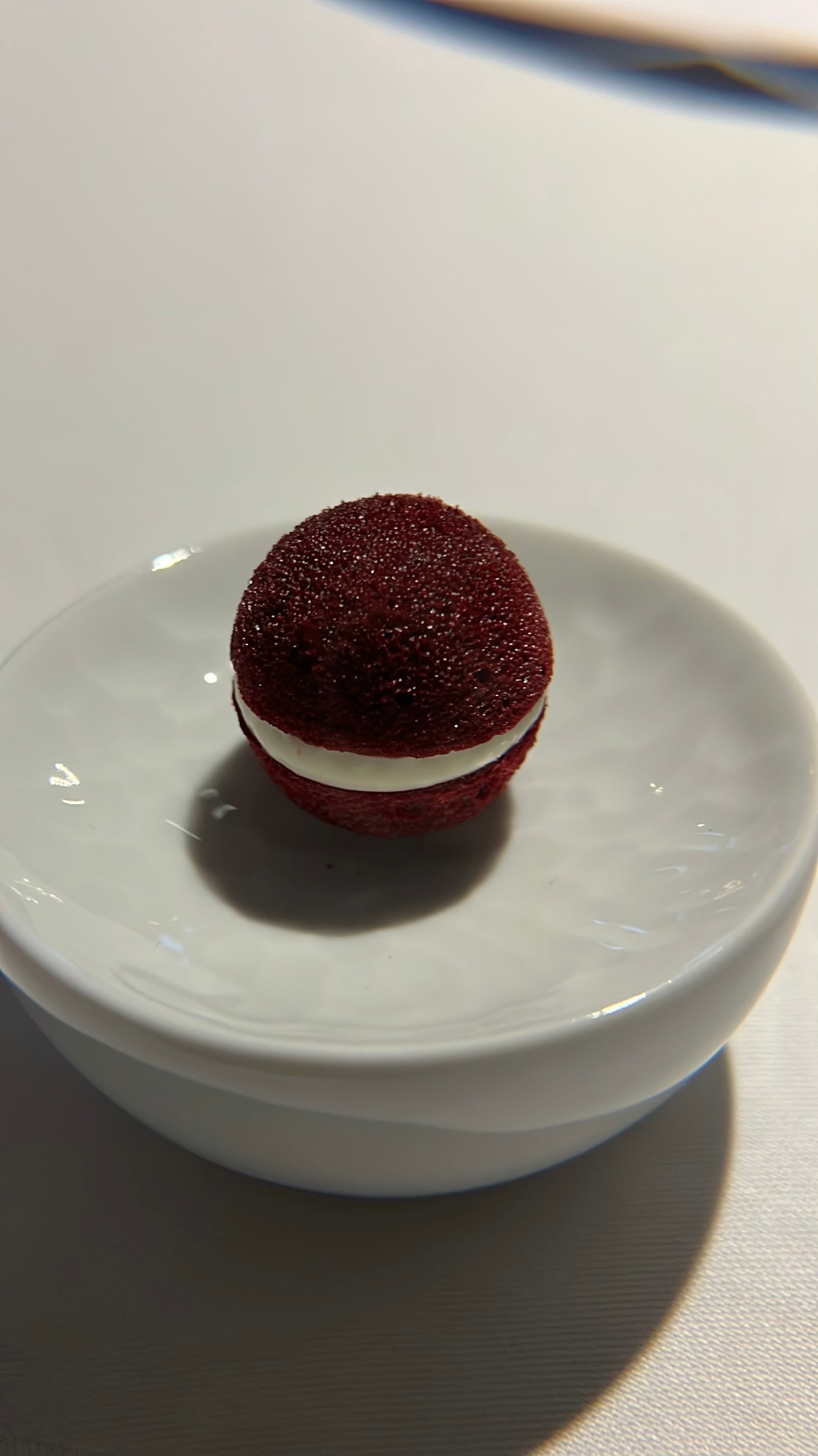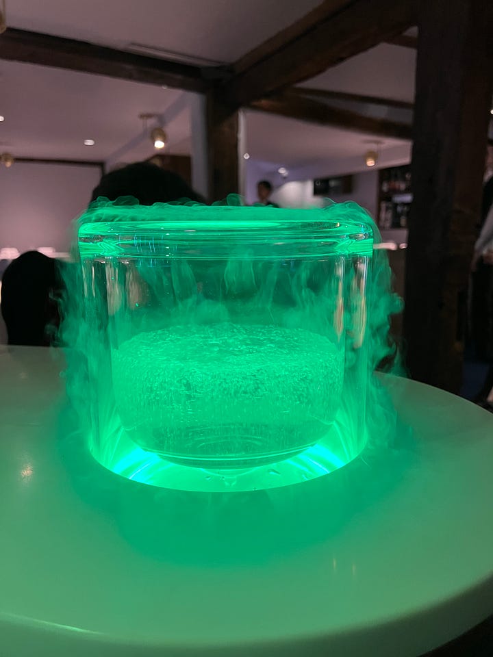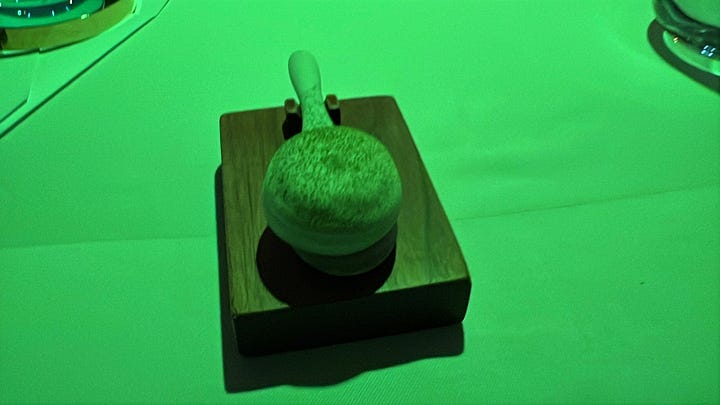 We begin with a palette cleanser, quite different from any other restaurant I have been at. It’s an aperitif that’s submerged and frozen in Liquid nitrogen. An introduction to the world we are about to witness. It’s served and taken in one bite, and melts through the mouth. At this stage the lights hue goes back to normal.