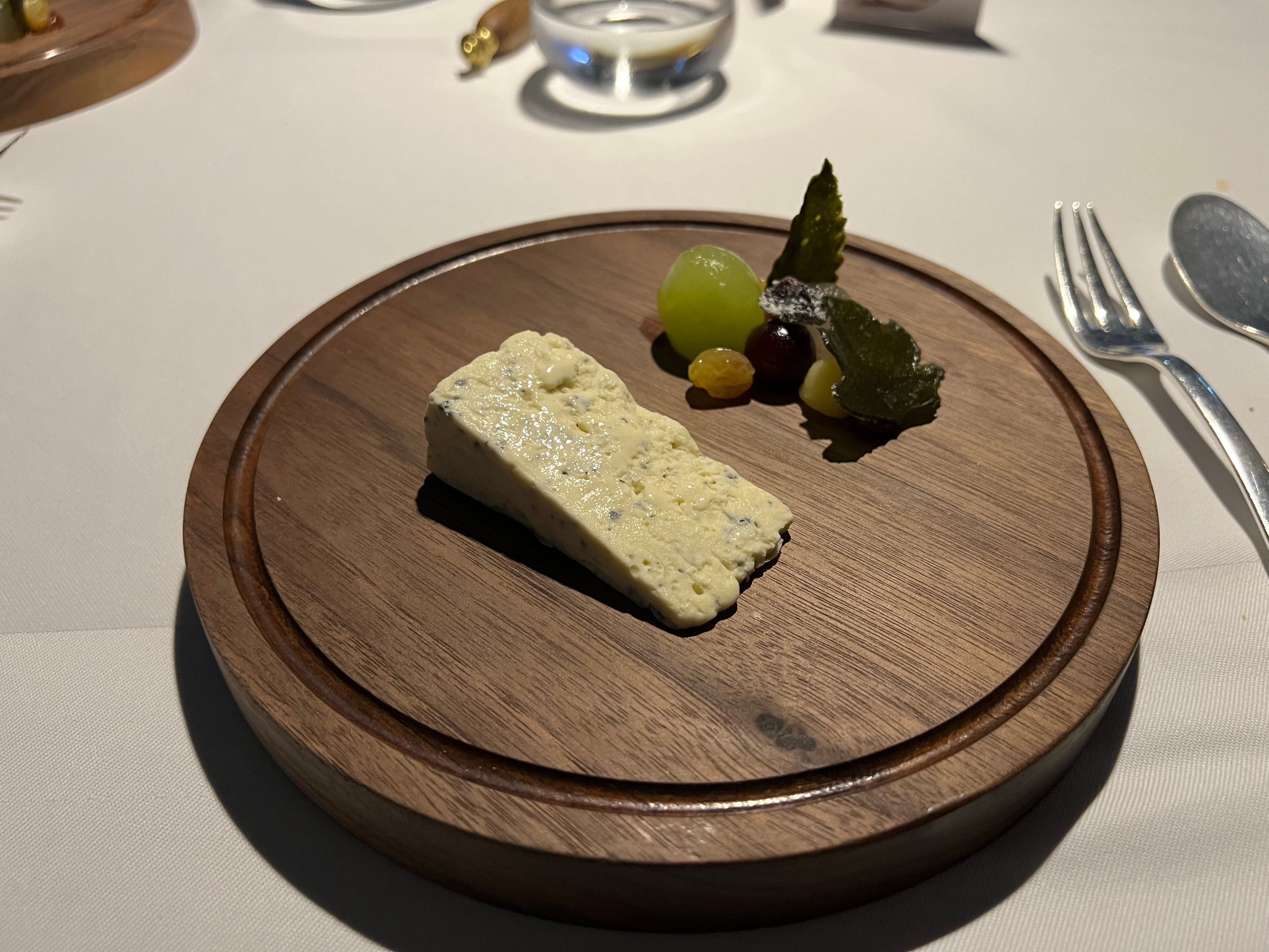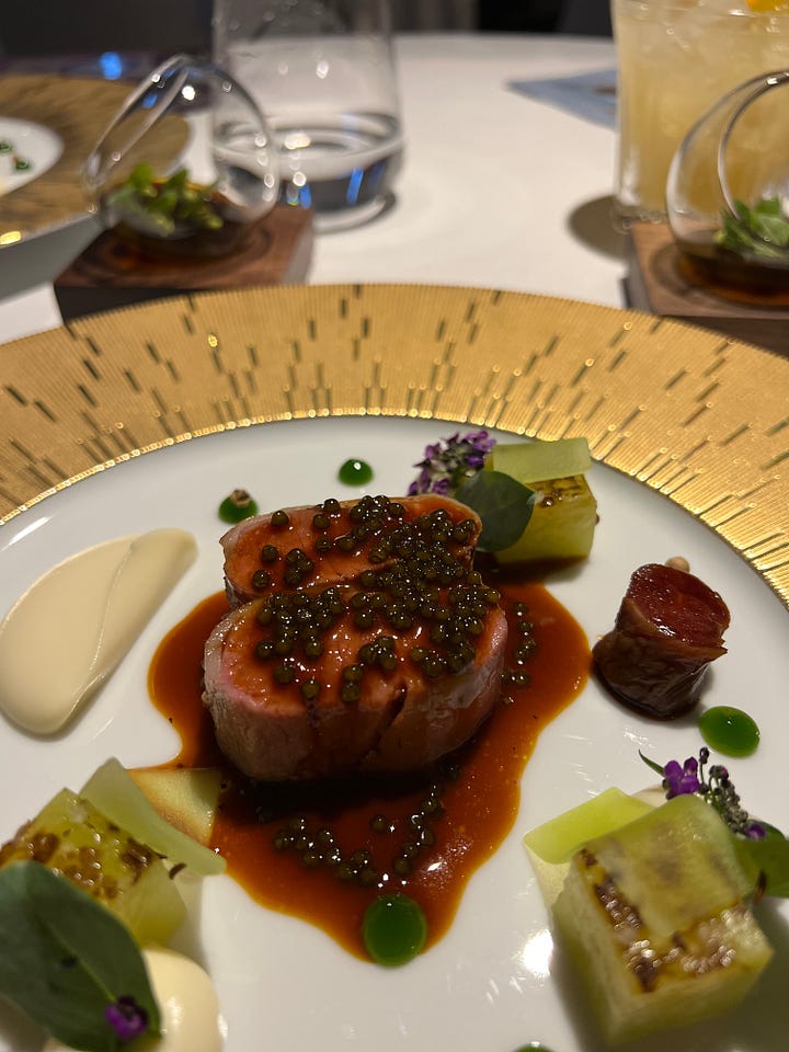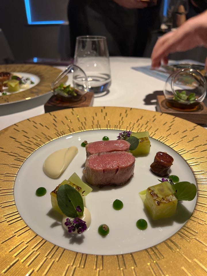 A beautifully executed lamb dish arrived topped with caviar and accompanied by a delicate jelly on the side. It was served alongside a playful cheese and grape interpretation: a cheesecake-like creation paired with a grape-shaped element that wasn’t actually a grape, adding a whimsical twist.