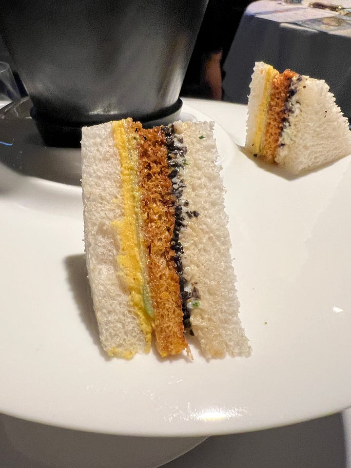 The “tea bag” was actually a delicate sheet of gold leaf which dissolved as soon as it touched the hot kettle. We then poured the infused liquid into a cup already filled with bacon bits and other garnishes, transforming it into a rich, savoury soup. The dainty sandwiches alongside it elevated the experience even further.