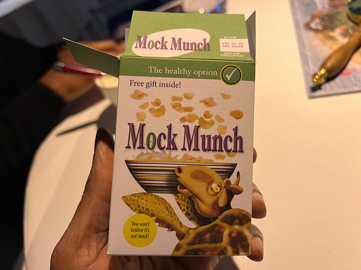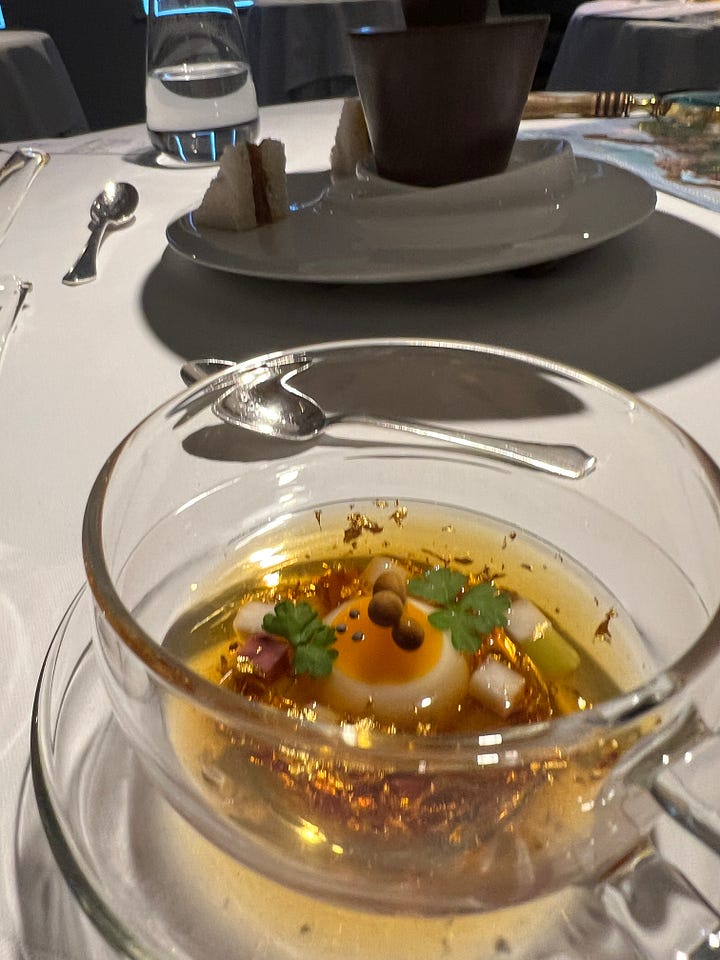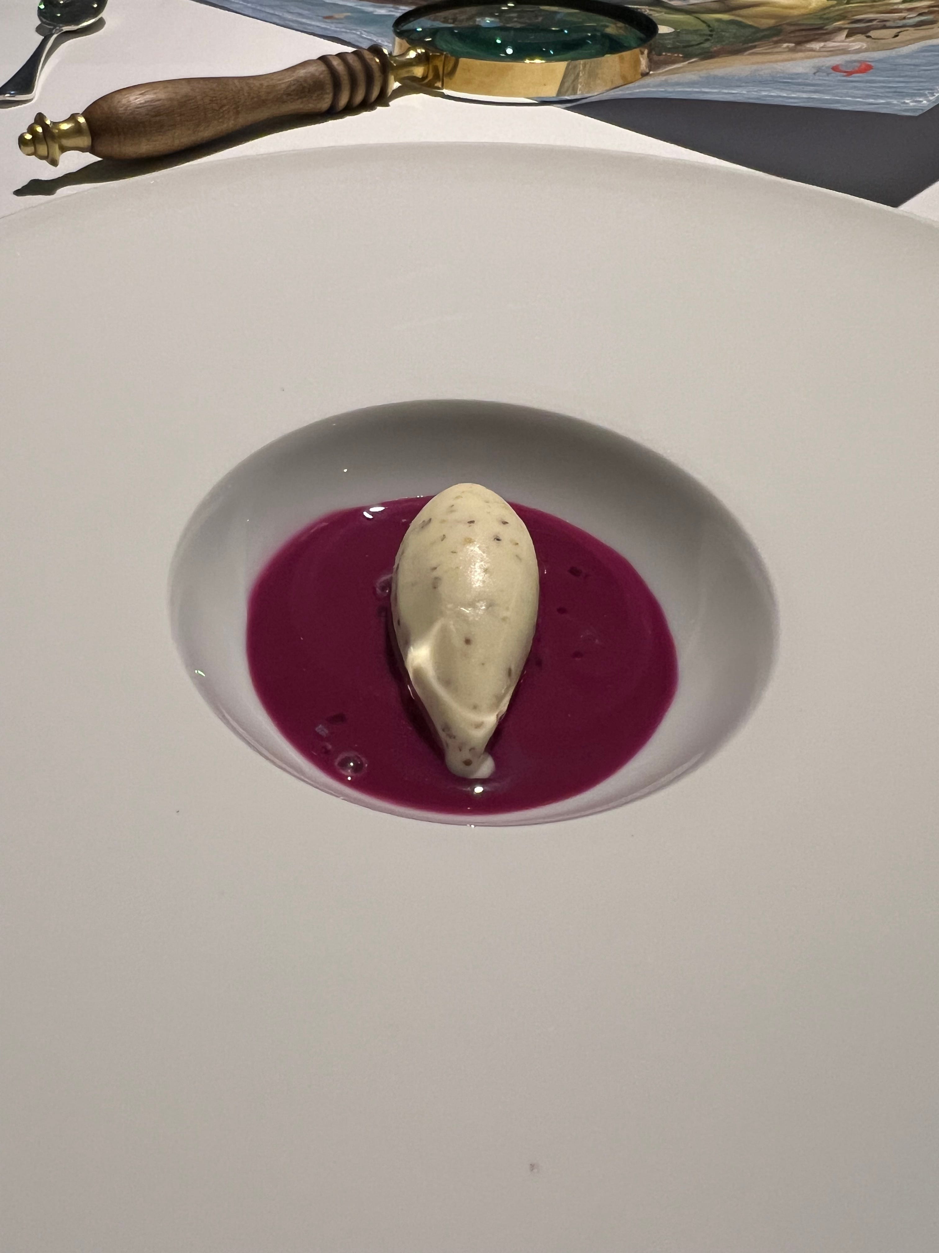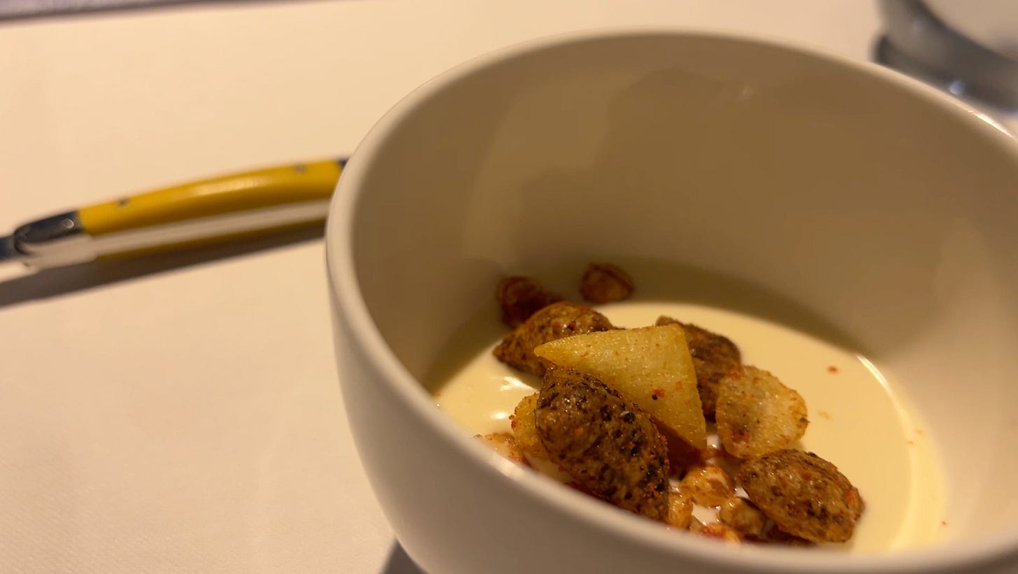 Nothing could prepare me for what we received here. It was a close simulation of a breakfast, starting with ‘milk’ in a bowl, and a couple of cereal boxes similar to the Kelloggs family variety pack. We receive a cereal box, and then pour the contents into a bowl (that had the ‘milk’ in it) and mix. The server welcomed us with a cheerful ‘Good morning’ as this course was served. The ‘milk’ was a cream soup and the mix was beautiful. Creating a titillating experience in your mouth. The course is off to a great start.