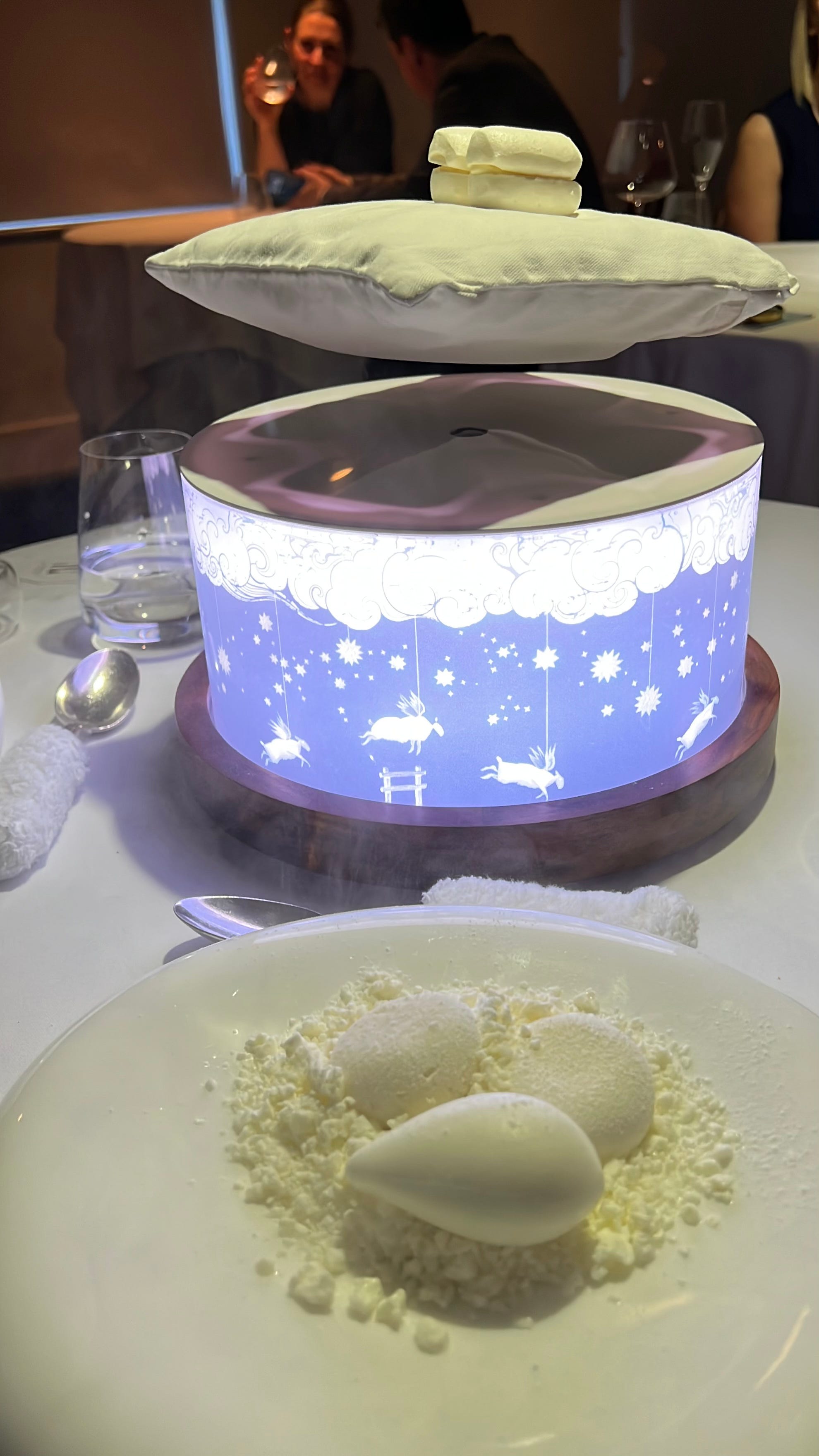 The “Goodnight’s Rest” dessert, presented on a levitating pillow of dreams, was one of the evening’s most extravagant displays. A pillow appeared to float and be suspended mid-air, topped with delicate meringues. While the engineering behind it (likely magnetic levitation with opposing forces between the pillow and the base) may be straightforward to the ‘initiated’ , the visual impact and wow factor was undeniable. It wasn’t mere theatrics; it was storytelling. The creativity, intention, and integration into the narrative of the night were remarkable, bringing the experience to a perfectly satisfying close. Starting with breakfast, all the way to goodnight.