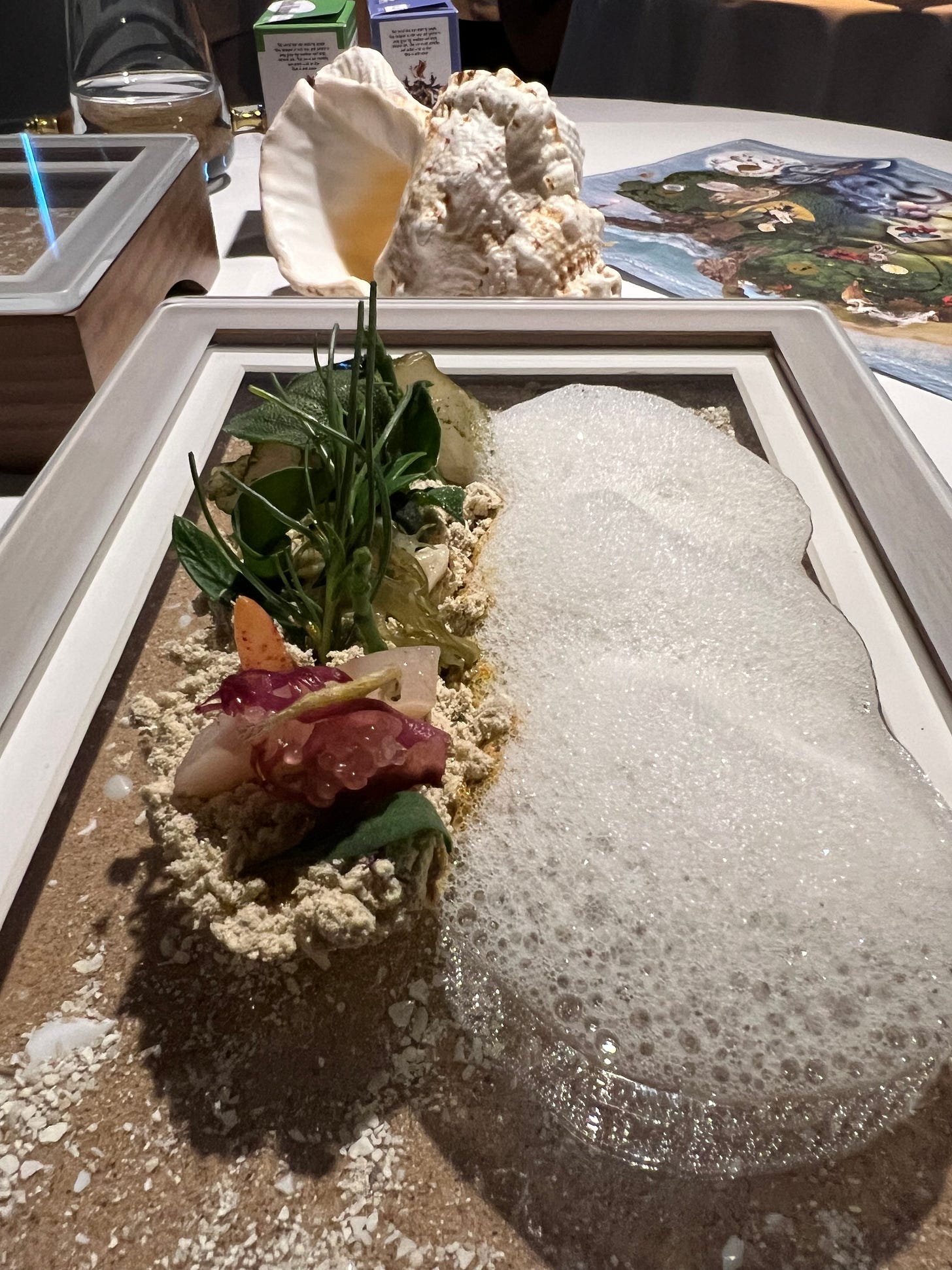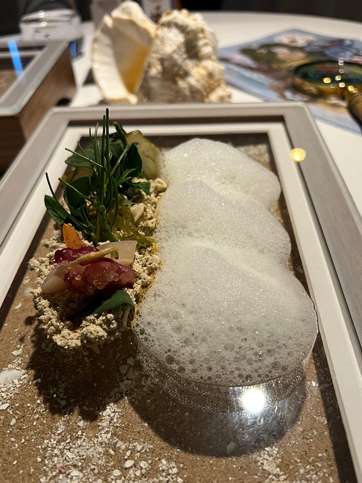 This course leads into the ‘Sound of the Sea’ dish. Anyway, the next dish comes, and it’s an analogy of the sea on a plate. It resembles the ocean, another the beach sands and seafood. No explanation was provided for this dish, apart from the fact you wear the headsets and be transported to a seaside. Mine was to Mauritius. The auditory aspects were sounds of the oceans, with waves crashing, audio of tidal movements, gentle surfing. The course had Edible sand prepared with cassava roots, classic kingfish, halibut and mackerel. An auditory taste experience may be the best way to describe it. More senses activated at the same time for this plate.