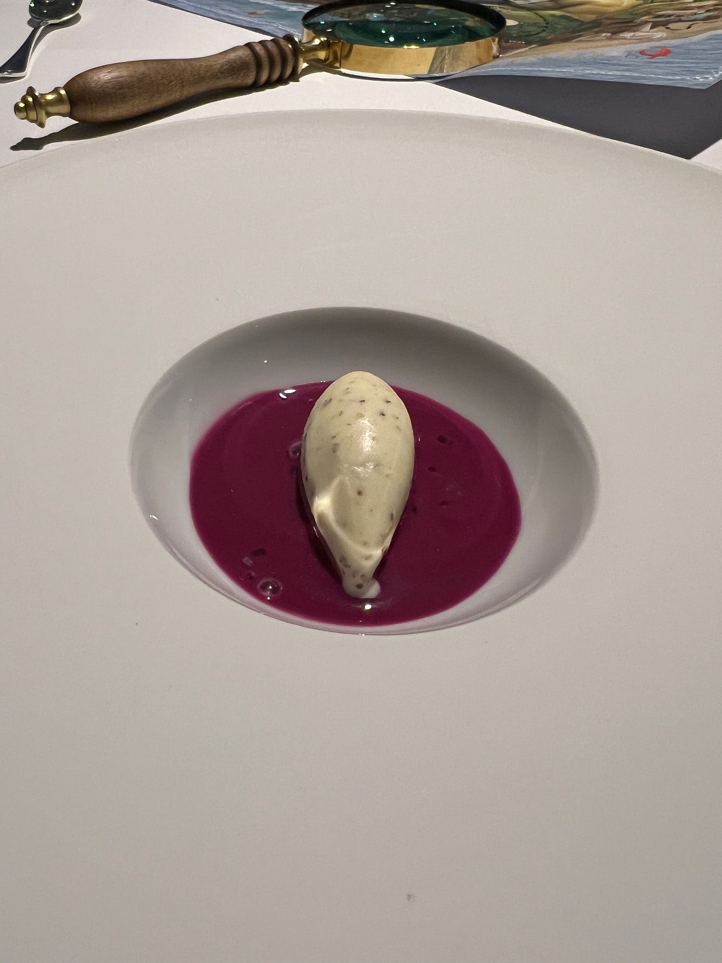 Each table is set with a magnifying glass and no cutlery, just a magnifying glass, glass tumblers and napkins. What’s a magnifying glass doing on a dining table? This is the first sign that the dinner we are embarking on is not going to be a normal journey. After a few back and forth with the servers for drinks, we reach a point where the hue of the light bulb changes. First the light directly on our table goes off, and then warmly lights on to a different hue signalling the start of the first amuse bouche.