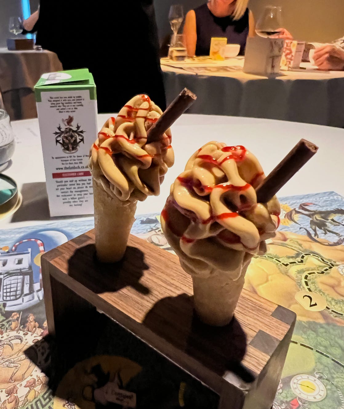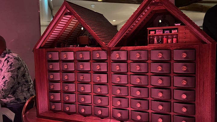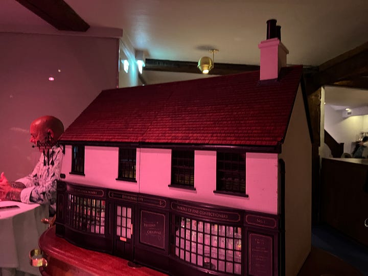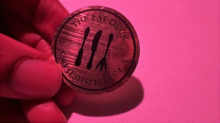 One last stop: The final offering was a unique dessert presentation: a building model of The Fat Duck pre-renovation, set on a trolley. This model split open to reveal numerous small cabinets. After inserting a Fat Duck-branded penny, the cabinets opened sequentially, culminating in two final compartments showcasing the sweets. The selection included chocolates, such as a Queen of Hearts-shaped bar, a toffee, a milk chocolate slab, and a bonbon referred to as a “tea cake.”